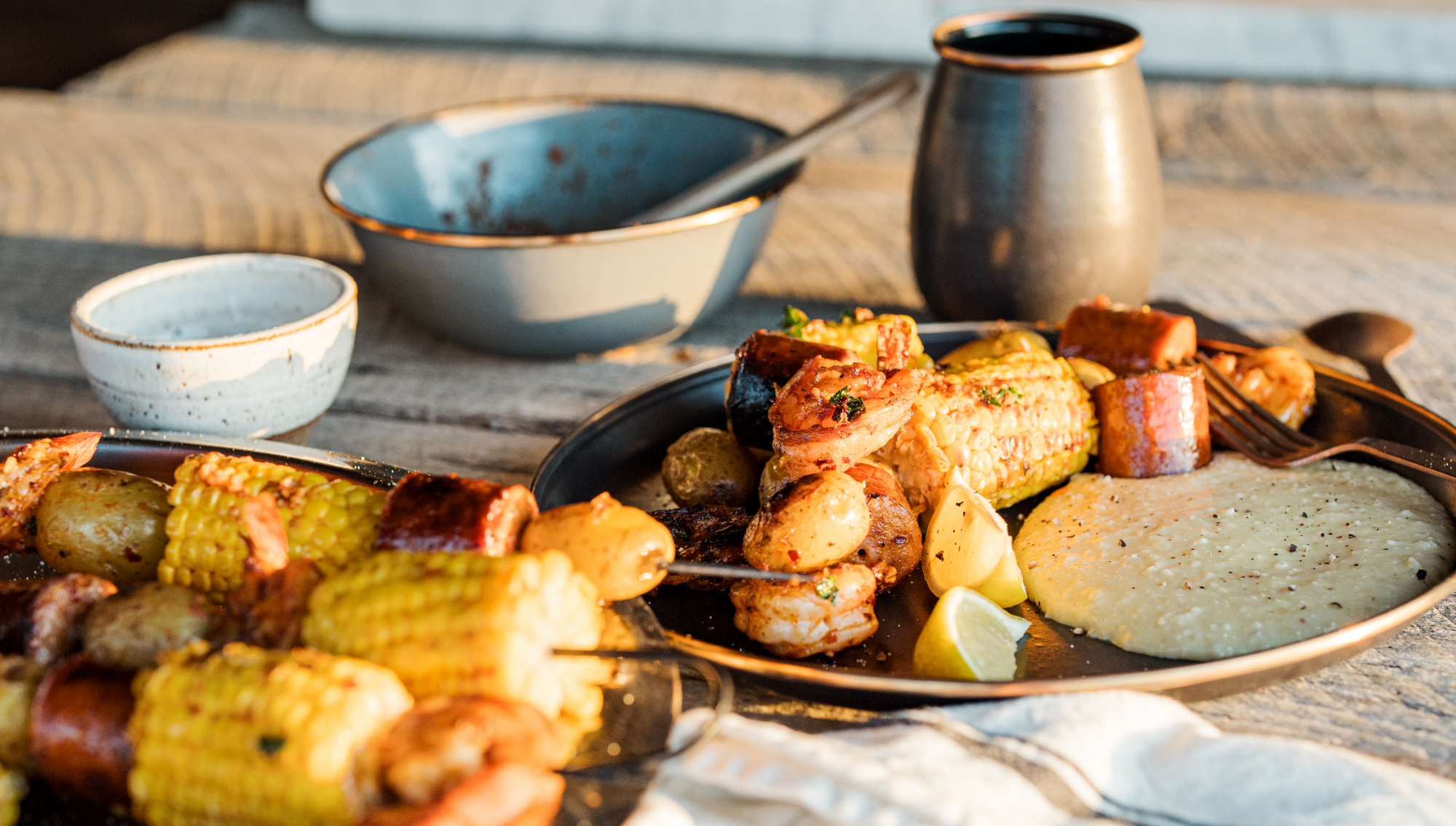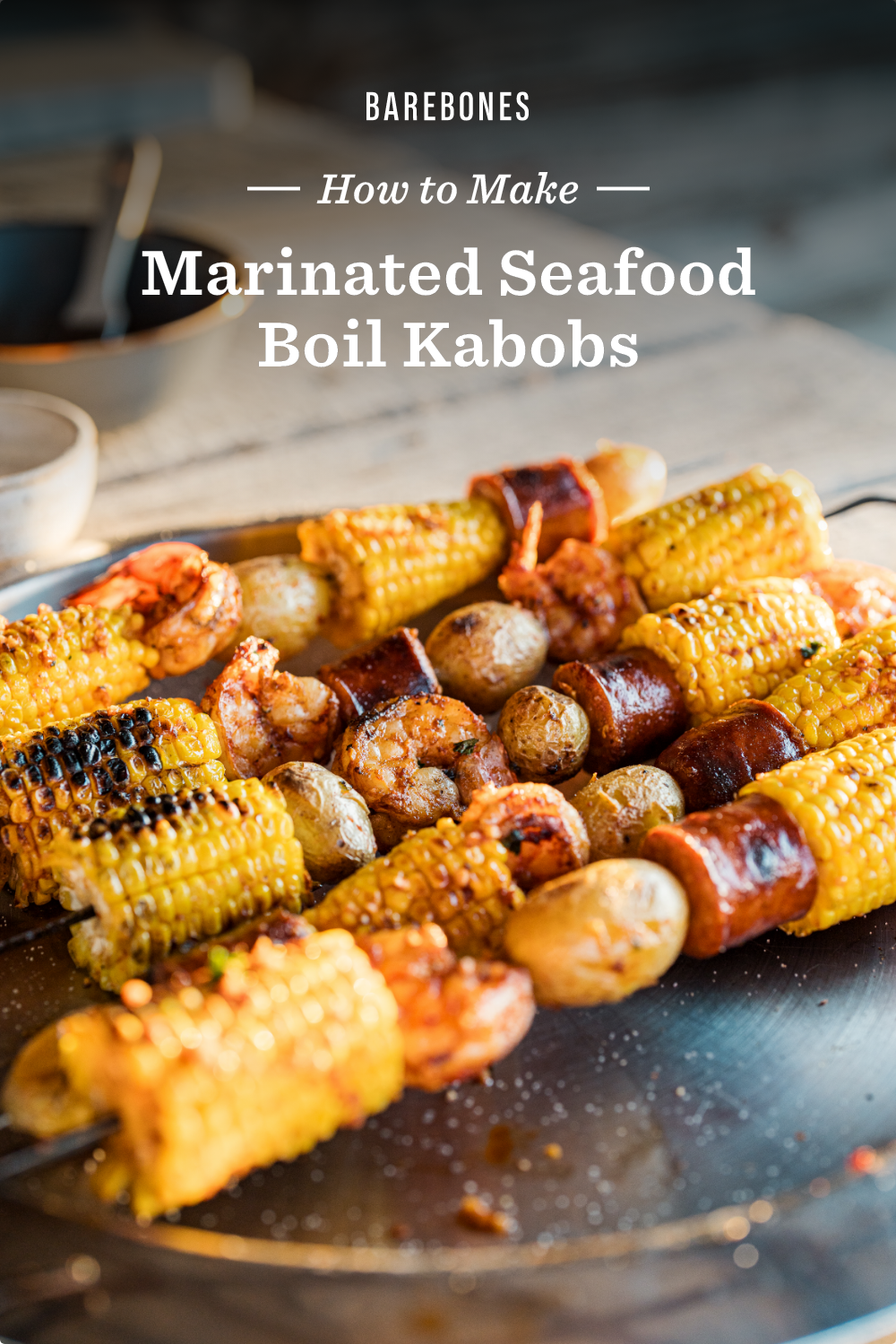 We’re starting with a Yogurt-Marinated Greek Chicken Kabob, rich with lemon and fresh dill, perfect for serving alongside pita and salad. Next, our Marinated Seafood Boil Kabobs give you all the flavors of a low-country boil—corn, potatoes, sausage, and shrimp—grilled to smoky perfection.