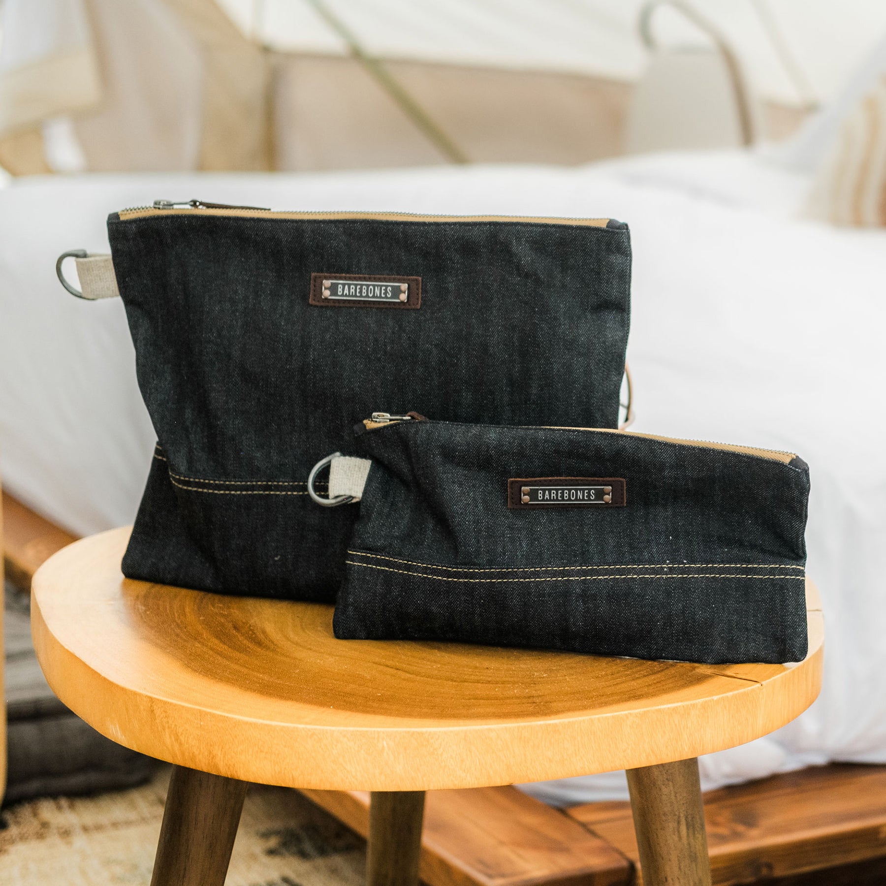 The perfect pouch to organize everyday items in style. Great for your digital readers, books, small laptops (up to 12"), school supplies, or as a travel or camping organizer. The large zipper pouch boasts timeless neutral tones, exceptional versatility, and remarkable water resistance. Crafted from heavy-duty 14.5 oz denim and featuring sturdy metal hardware, these pouches are built to last a lifetime.