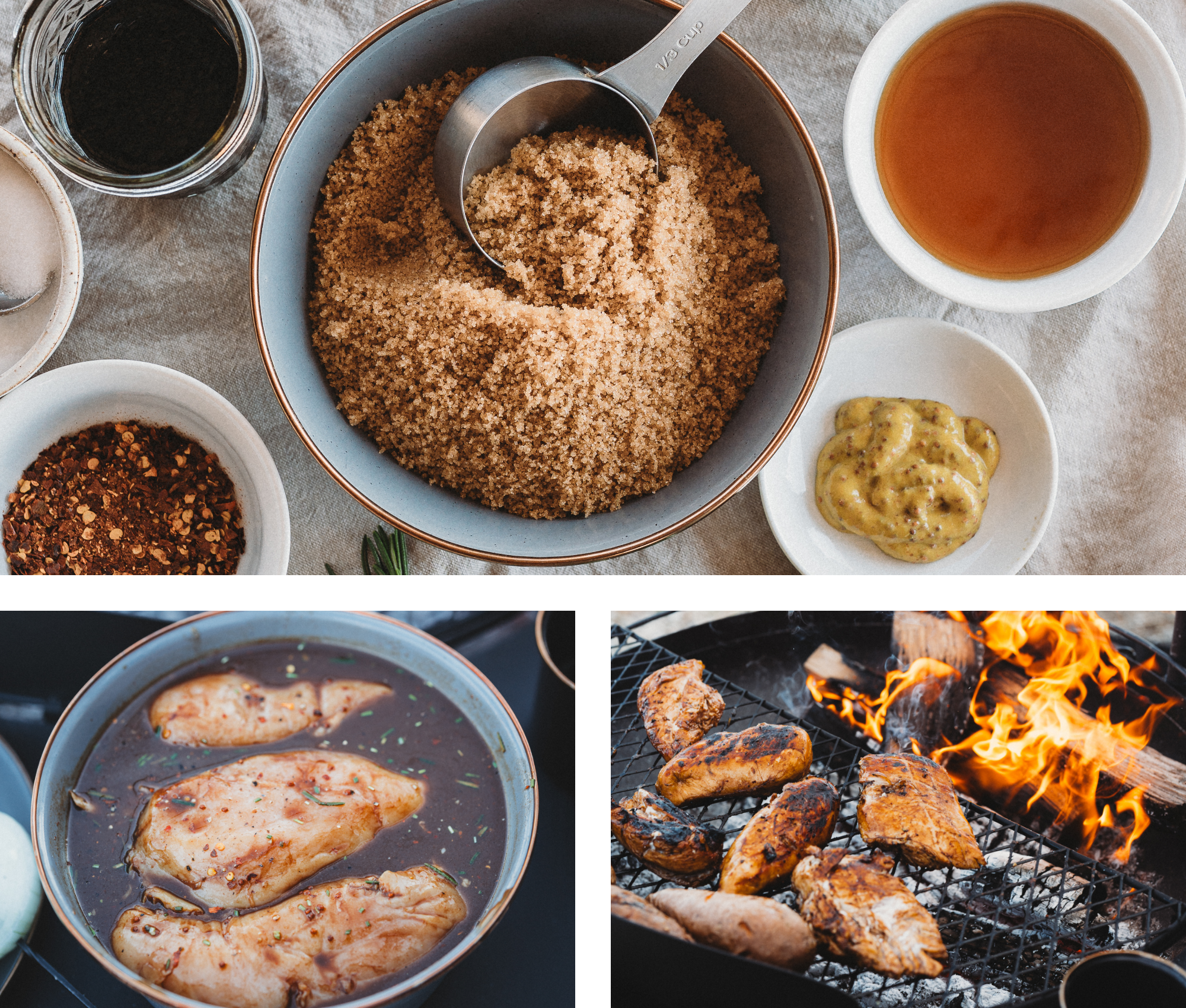 - For the chicken marinade recipe, pour the bourbon, brown sugar, balsamic vinegar, soy sauce, olive oil, mustard, garlic, rosemary, and crushed red pepper flakes into a jar with a lid. Season with 1-2 teaspoons of salt and ground black pepper, as desired. Put the lid on the jar and shake vigorously to combine.