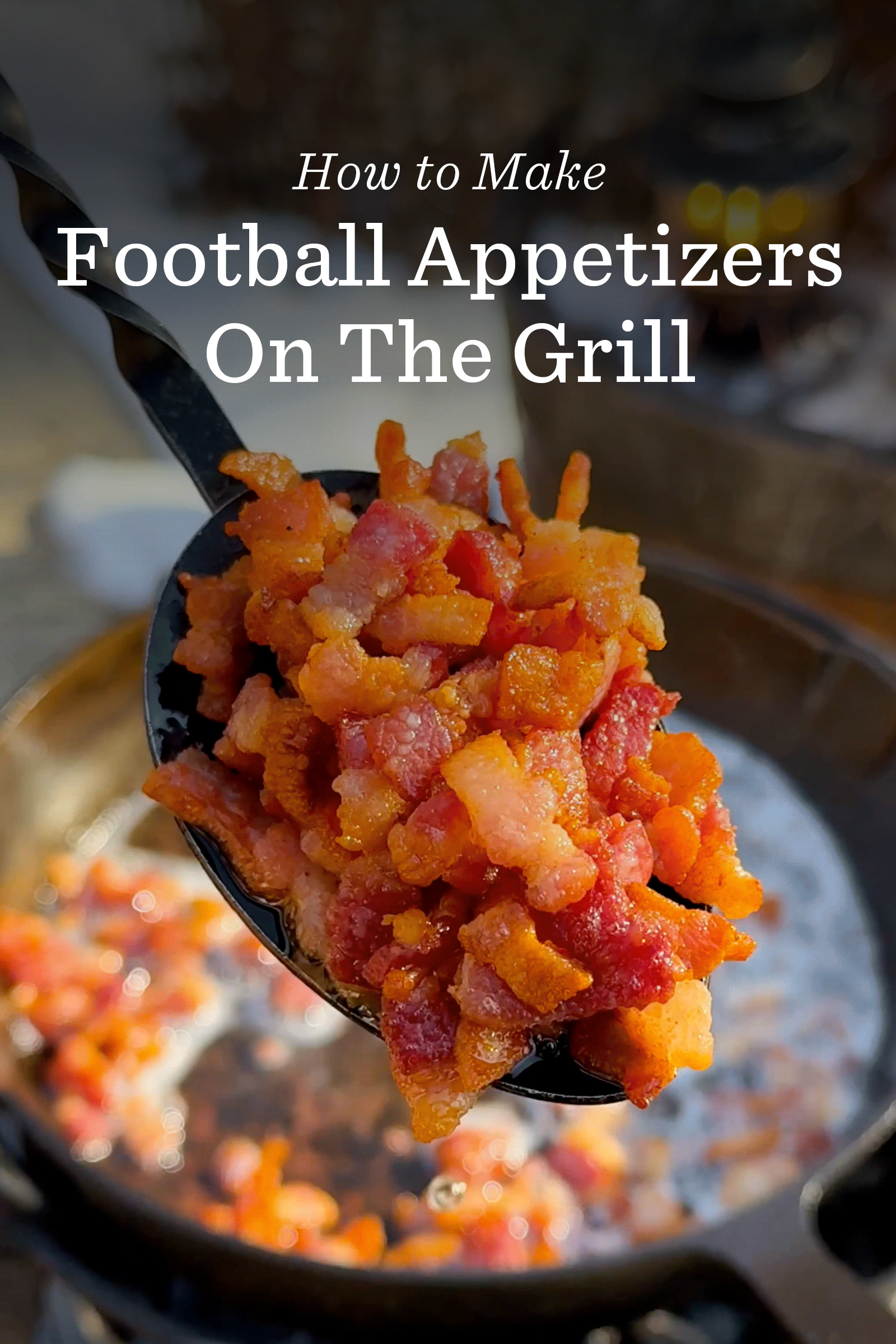 - Fire up the All-In-One Cast Iron Grill and preheat a skillet to cook bacon pieces and char up the little smokies. Set aside.