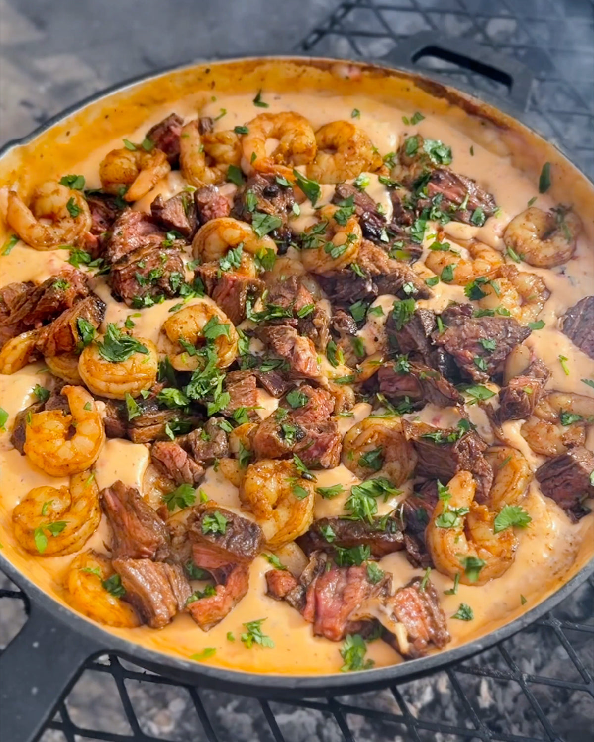 (Note: shrimp only need a few minutes!) - Dice up the steak and launch into the queso cheese for one incredible surf & turf dish!
